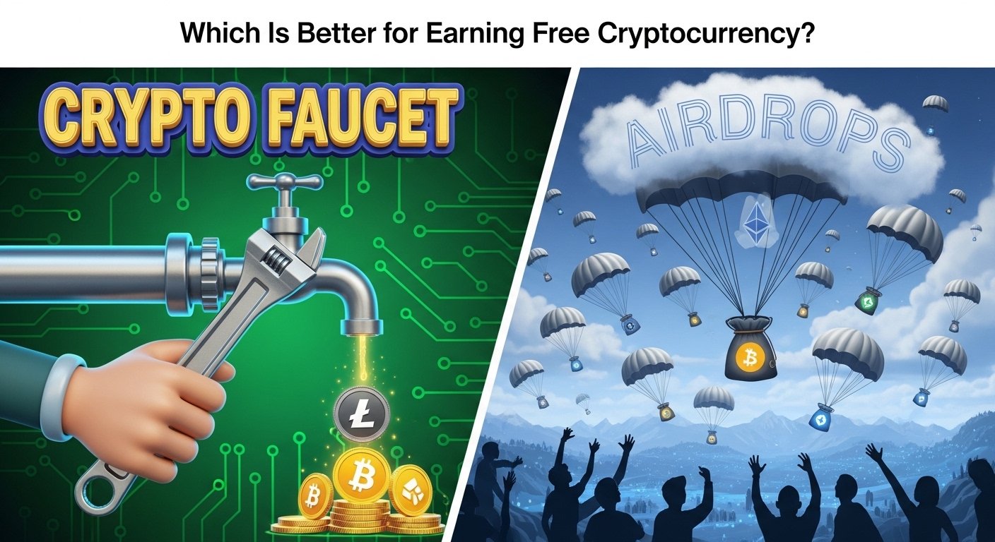Compare crypto faucets vs airdrops and learn which method is better for earning free cryptocurrency. Complete beginner guide with pros and cons.